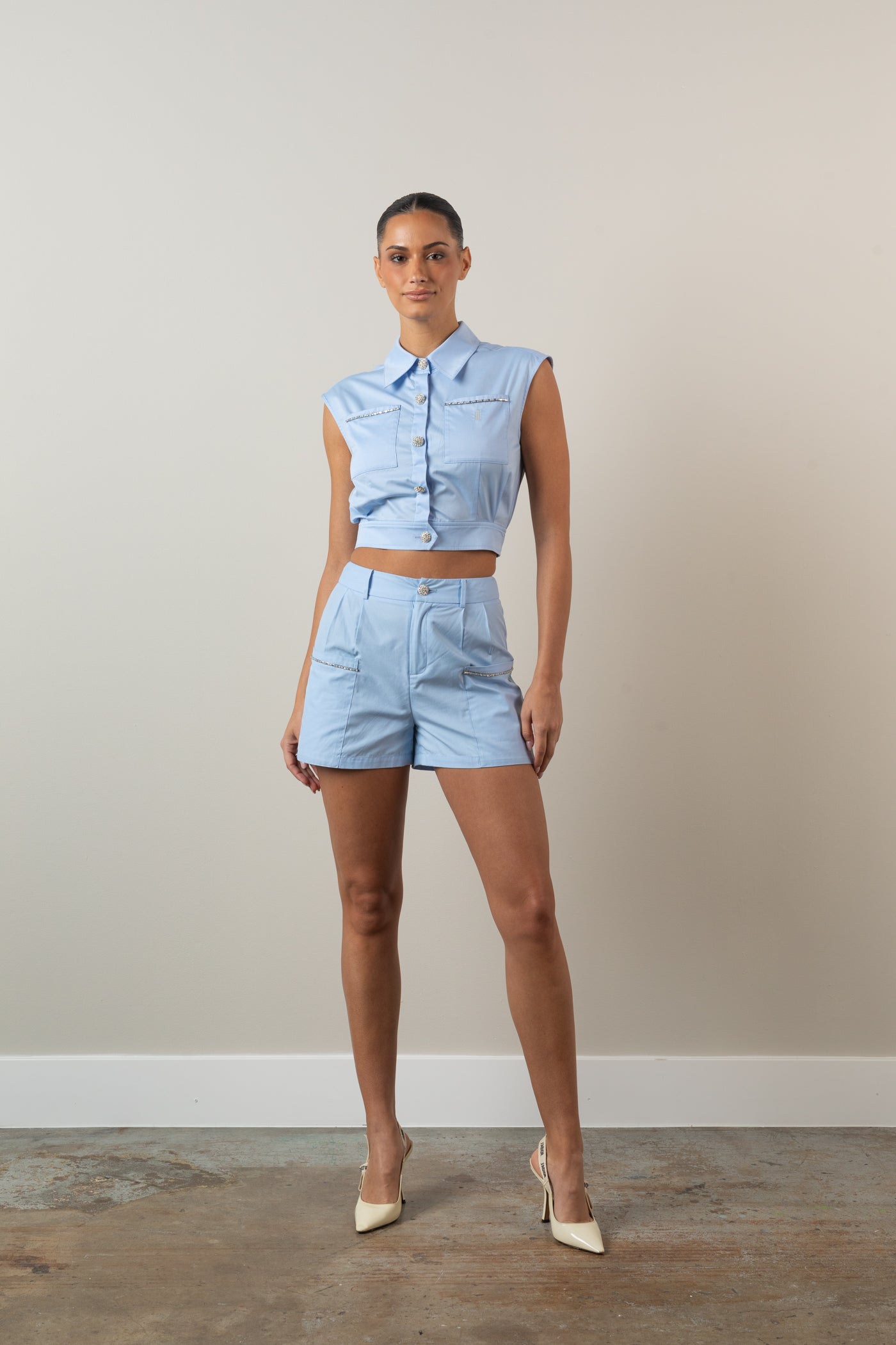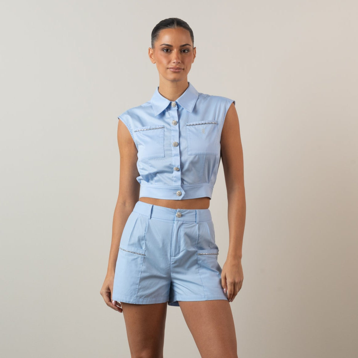 Soft, sky-blue charm with an elevated touch. This crop top adds personality to sunny outfits with sparkle, shape, and signature detailing.