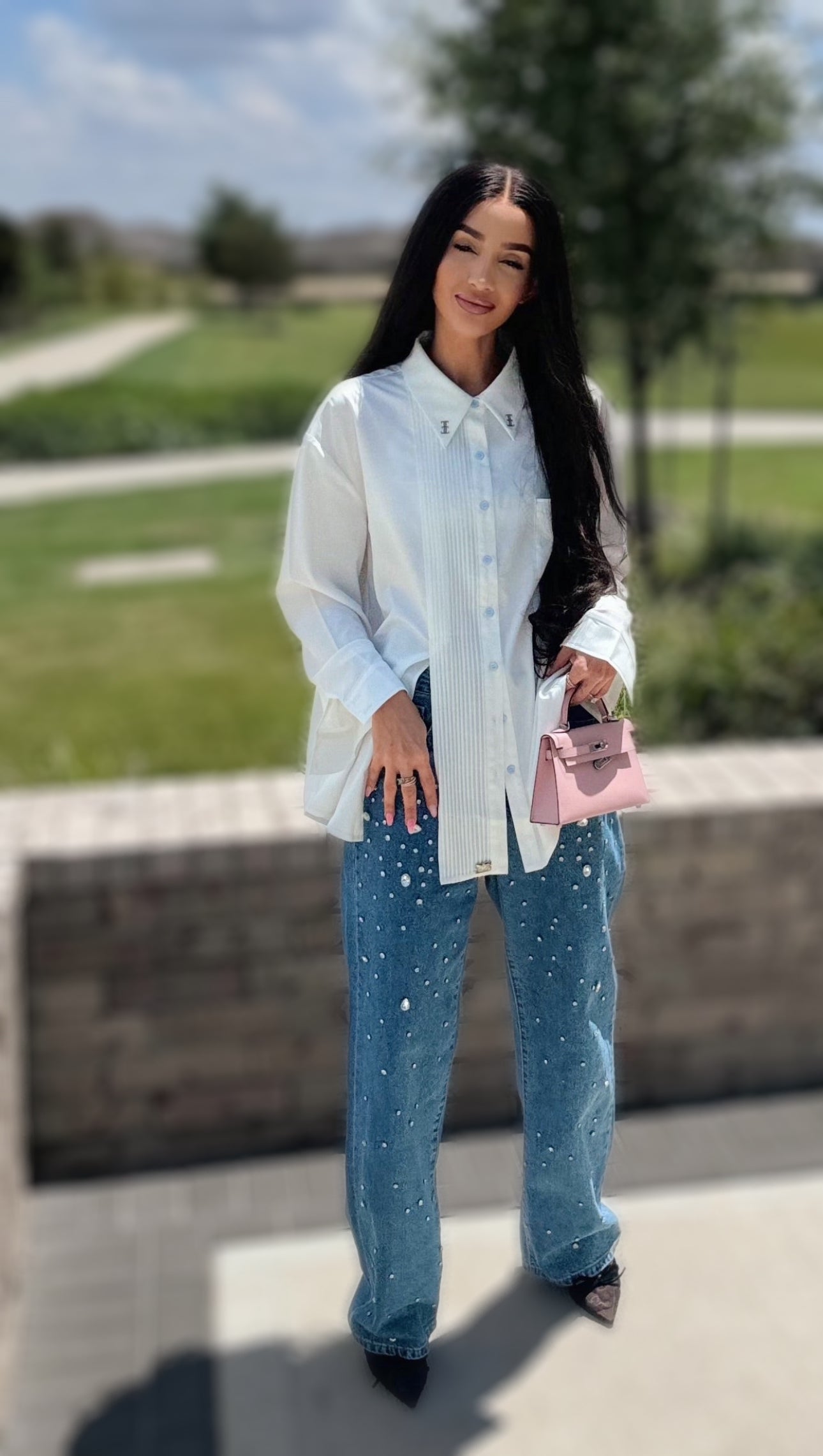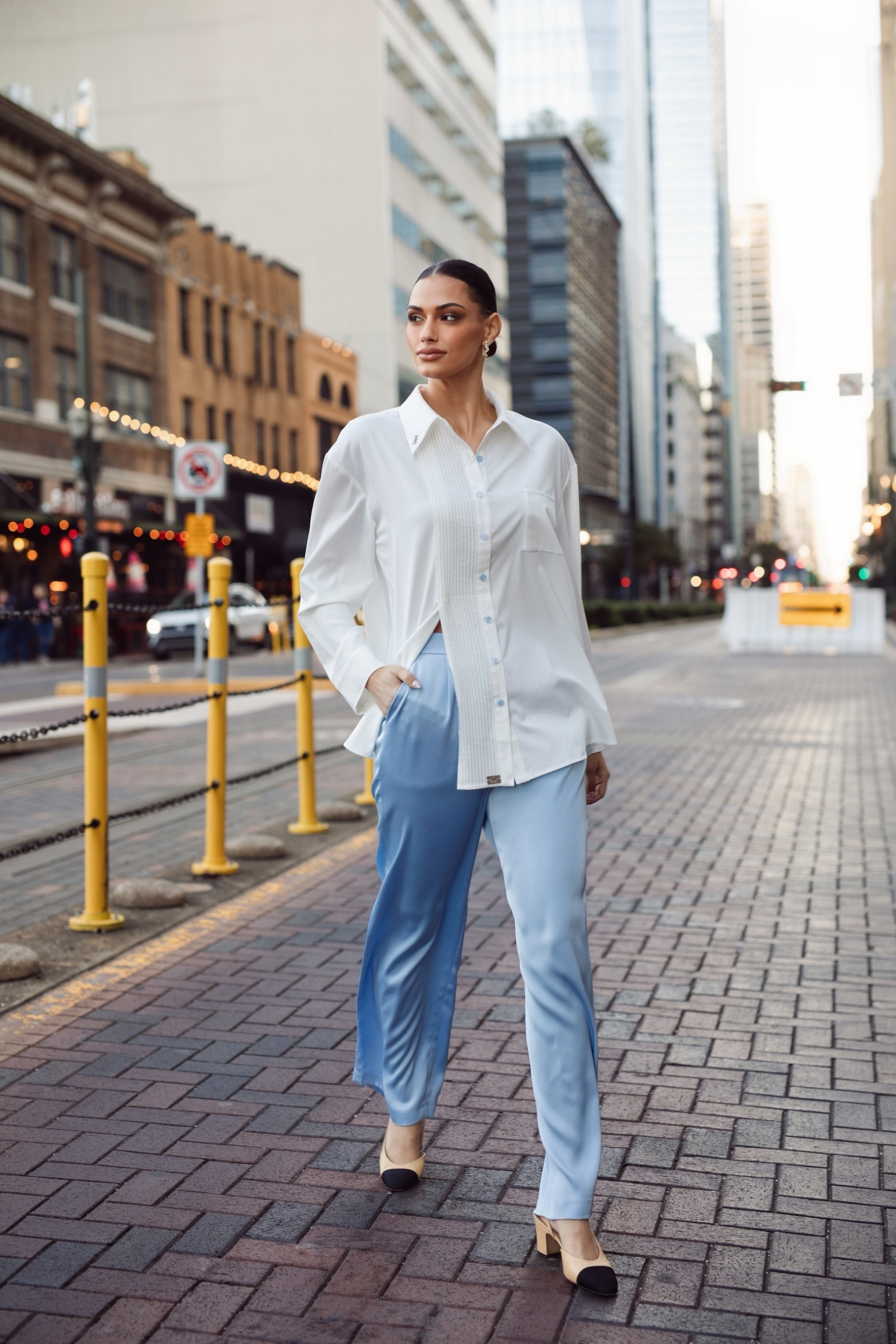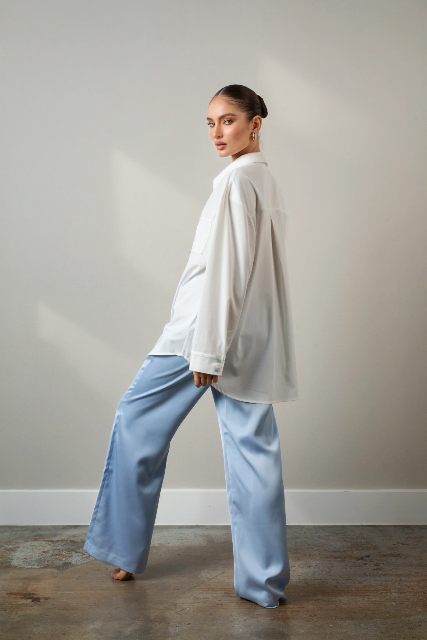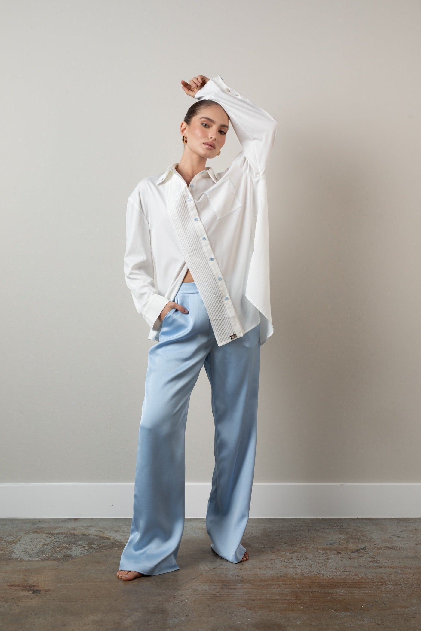 Effortless elegance in motion. This oversized shirt flows with ease, offering a crisp silhouette softened by thoughtful accents and vibrant detail.